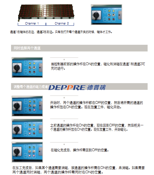 磁化和消磁可在中間分開的通道1和通道2,獨立進行。每個通道可選擇不同的磁力,分開使用: